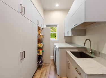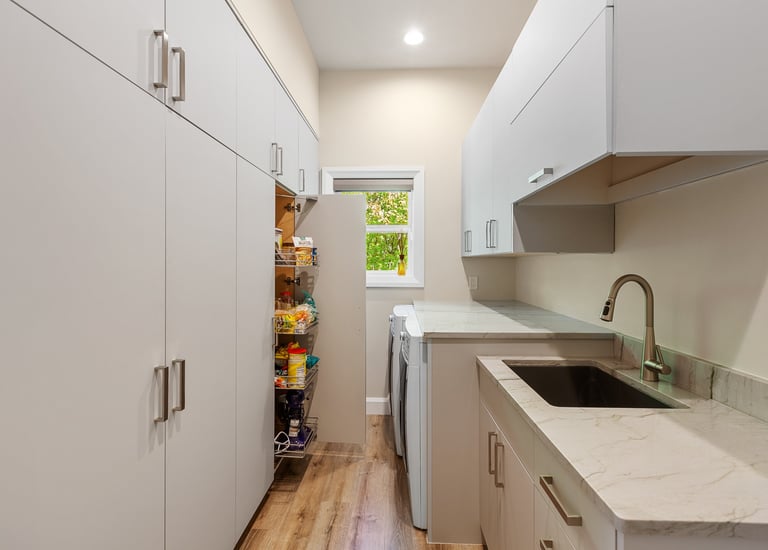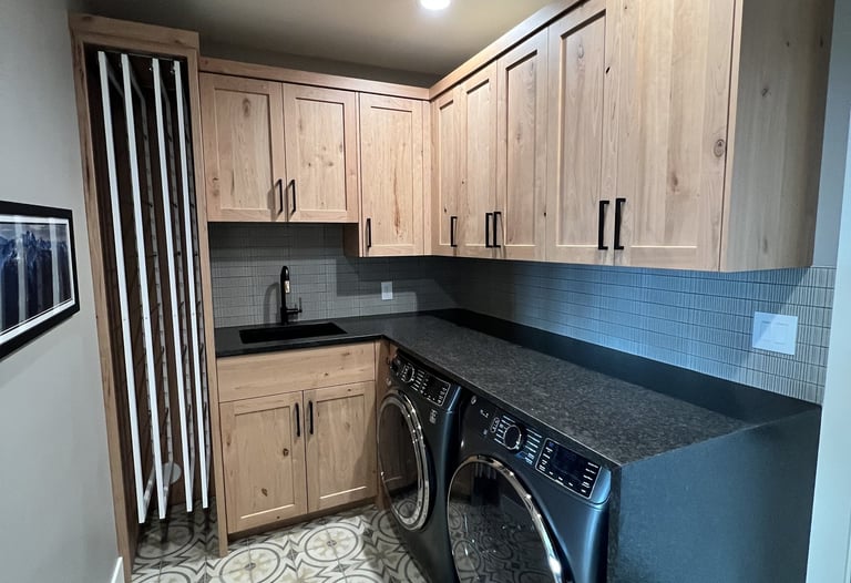 Custom cabinetry refers to cabinetry built to fit into your specific space without using fillers or standard sized cabinet boxes, typical of large cabinet manufactures.